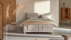 Met de Box Owen vlak met gestoffeerd matras geniet je van een chique hoteluitstraling in de slaapkamer. En dat altijd voor de laagste prijs. De box(en), het matras én het hoofdbord zijn gestoffeerd met zacht polyether. Door de 126 veren per m2 geniet je van een prima ondersteuning. De polyether comfortlaag van het matras en het polyether topmatras zorgen ervoor dat je lekker zacht ligt.